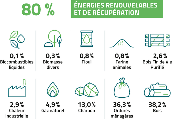 En 2024-2025, les énergies renouvelables et de récupération (EnR&R) représentent 80 % du mix énergétique utilisé par le réseau de Chauffage Urbain de Grenoble.